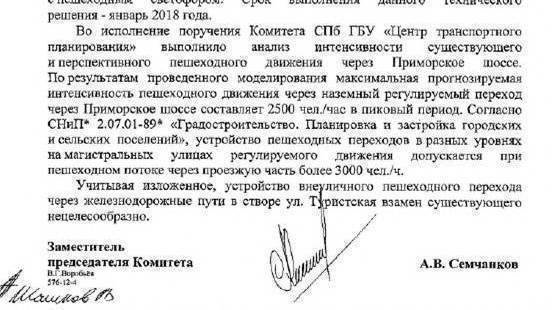 К сожалению, транспортные специалисты Комитета не заметили, что люди трагически погибают не на Приморском шоссе, а на железной дороге. И ошибочно применили положения СНиП, касающиеся планирования пешеходных переходов в разных уровнях через МАГИСТРАЛЬНЫЕ ДОРОГИ РЕГУЛИРУЕМОГО ДВИЖЕНИЯ, для отказа в строительстве пешеходного перехода через ЖЕЛЕЗНУЮ ДОРОГУ.