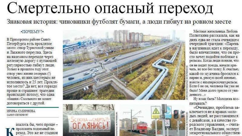В Приморском районе Санкт-Петербурга есть проклятое место: створ Туристской улицы и Лыжного переулка. Здесь на наземном переходе через железную дорогу с пугающей регулярностью гибнут люди. Только в прошлом году этот створ унес жизни семерых (!) человек, из них шестерым не исполнилось и 25 лет. Проклятое место? Да нет, все гораздо проще и страшнее: трагедии происходят потому, что одна «башня» Смольного не может договориться с другой.
