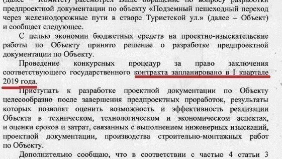 Письмом от 11.01.2019 Комитет по развитию транспортной инфраструктуры Санкт-Петербурга сообщил о переносе сроков заключения контракта на разработку предпроектной документации для подземного перехода на ул. Туристская - на I квартал 2019 года.