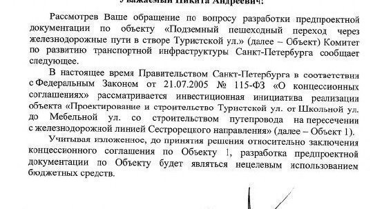В ответ на запрос о ходе проектирования подземного перехода Комитет по развитию транспортной инфраструктуры ответил, что никакого проектирования не будет.