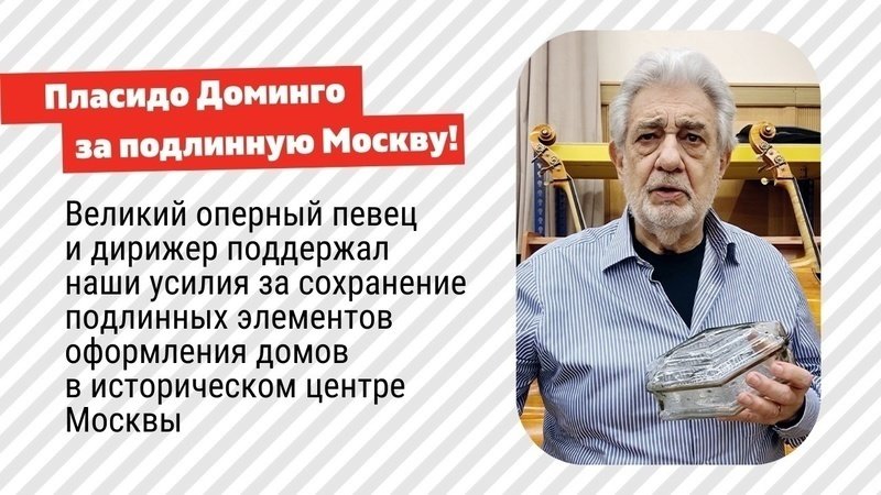 Сегодня у меня отличные новости - наши усилия поддержал известный во всем мире оперный певец и дирижёр, великий Пласидо Доминго. Для меня было большой честью встретиться лично с маэстро и рассказать ему о столь важной, актуальной проблеме Москвы и о нашей кампании. Маэстро отметил, как важно защищать и сохранять историческую архитектуру России и Москвы, её подлинность и уникальность!