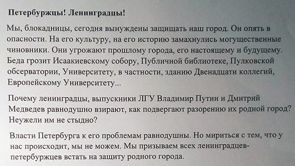 "Мы, блокадники, сегодня вынуждены защищать наш город. Он опять в опасности. На его культуру, на его историю замахнулись могущественные чиновники. Они угрожают прошлому города, его настоящему и будущему" , - заявили блокадницы.