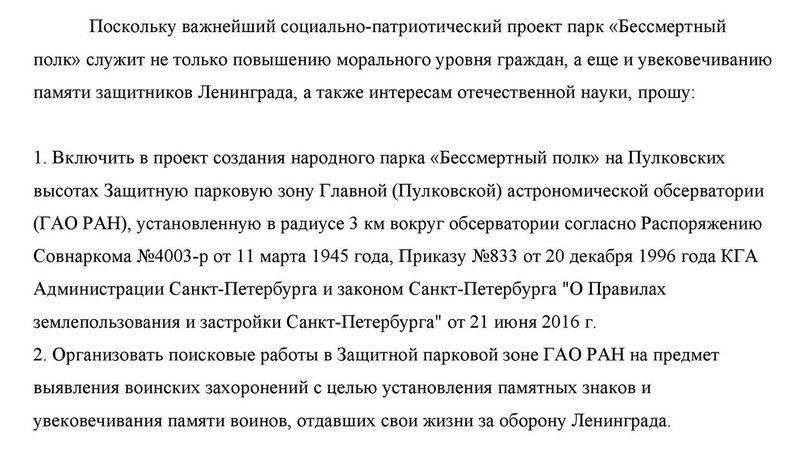 О необходимости проведения поисковых работ на предмет выявления воинских захоронений и создания парка «Бессмертный Полк» на территории защитной парковой зоны (ЗПЗ ГАО РАН) Пулковской обсерватории радиусом 3 км
