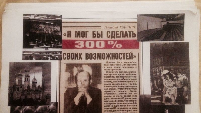 Случилось самое страшное, что можно было ожидать: бюрократический произвол уничтожил творца, мастера, его театр и его дело! Сорок пять лет своей творческой жизни академик, изобретатель, драматург, режиссер Г.И. Юденич отдал борьбе за реформаторское преобразование нашего театрально-зрелищного искусства.