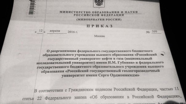 В сети появился проект Приказа о слиянии МГРИ-РГГРУ и Губкинского Университета. Официального подтверждения того, что такой приказ подписан - НЕТ.