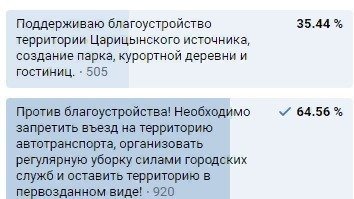 https://vk.com/bookmarks?from_menu=1&w=wall153576931_8475 Он, несомненно, представляется вернее, ближе к истине, в отличие от вышеупомянутого, организованного группой авторов проекта, поскольку соответствует характеру тех многочисленных из комментариев, что появляются по данному поводу каждый раз https://vnru.ru/news/64638-spory-vokrug-blagoustrojstva-tsaritsynskogo-istochnika-ne-utikhayut.html .