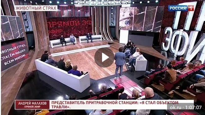 Судьбу медведицы Маши с притравочной станции в Фирсановке и судьбу животных на сотнях таких же станций в стране обсуждали в ток-шоу Андрея Малахова Россия 1.