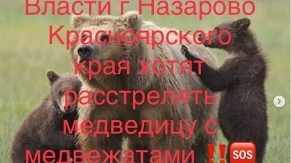 THE AUTHORITIES OF THE CITY OF NAZAROVO DECIDED TO SHOOT A BEAR WITH CUBS In the city of Nazarovo, Krasnoyarsk Territory, a mother bear with cubs has come out to people from hunger. The local administration has made an inhumane decision to shoot a family of bears, instead of taking them away to the taiga.