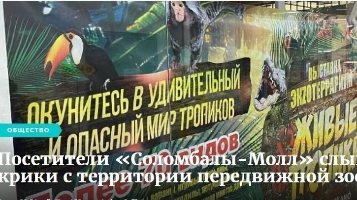В Архангельске в крупном торговом центре работает выставка экзотических животных. Покупатели обратили внимание на истошные крики обитателей экзотеррариума, которые доносятся в санитарные дни, когда выставка не принимает зрителей. Журналист издания «Двина Сегодня» был очевидцем такой ситуации, крики животных были слышны в соседнем отделе «Детский мир» и вызвали большие сомнения в комфортности пребывания животных. https://bit.ly/3P5Wkcy