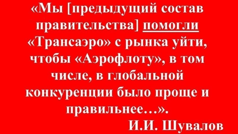 Бывший первый зам.пред. Правительства РФ Шувалов И.И. признается, что остановка системообразующего частного предприятия, одного из самых узнаваемых во всем мире, являющимся вторым по объему перевозок в РФ и первым по безопасности в РФ среди авиакомпаний была организована правительством РФ преднамеренно, в угоду узкого круга лиц, чтобы убрать глобального конкурента и расчистить дорогу тем, кто не хочет работать прозрачно, понятно и конкурентоспособно.