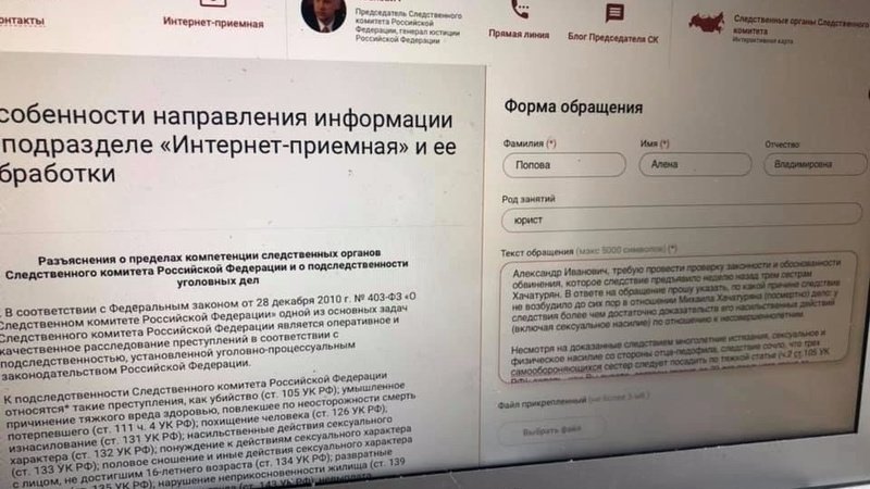 Александр Иванович, требую провести проверку законности и обоснованности обвинения, которое следствие предъявило неделю назад трем сестрам Хачатурян. В ответе на обращение прошу указать, по какой причине следствие не возбудило до сих пор в отношении Михаила Хачатуряна (посмертно) дело: у следствия более чем достаточно доказательств его насильственных действий (включая сексуальное насилие) по отношению к несовершеннолетним.Несмотря на доказанные следствием многолетние истязания, сексуальное и физическое насилие со стороны отца-педофила, следствие сочло, что трех самообороняющихся сестер следует посадить по тяжкой статье (ч.2 ст.105 УК РФ): теперь, как Вы знаете, сестрам грозит до 20 лет реального срока за самооборону. При этом следствие не разъясняет, почему же Михаил Хачатурян-насильник-не назван самим же следствием таковым, а самообороняющиеся дочери, которых он истязаю, названы самим же следствием УБИЙЦАМИ.