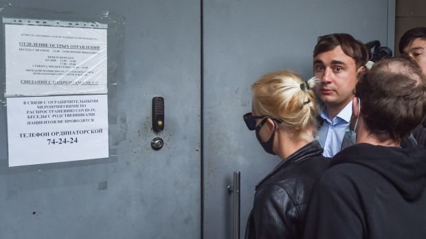 Фотография: Жена Алексея Навального Юлия стоит перед больницей в Омске. Фото: Максим Карлаев / EPA https://www.irishtimes.com/news/world/europe/russian-opposition-activist-alexei-navalny-fights-for-life-after-poisoning-1.4334801
