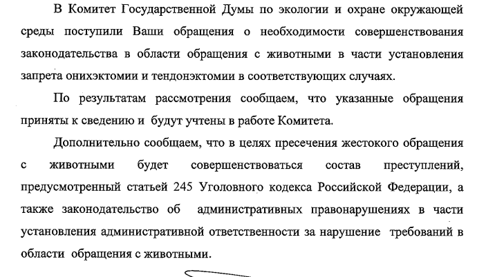 Вот какую мысль в связи с этим я думаю: ну подправят они 245, внесут или вынесут что-нибудь в КОаП, но сдается мне, что кошек это не спасет от онихэктомии. В законе должен быть перечень запрещенных операций, или уточнение перечня жестоких деяний. Если этого не будет - значит, каждый раз придется доказывать, что это увечье, к тому же, кто будет это делать? Ветеринар, изуродовавший зверя или хозяин, который это заказал?
