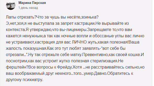 Э,нет,зоя,я не выступала за запрет кастрации.Не вырывайте из контекста.Я утверждаю,что вы-лицемеры.Запрещаете то,что вам кажется ненужным,а так как ночные вопли и обоссаные углы вас лично не устраивают,кастрация для вас ЛИЧНО жуть,какая полезная!Ваша жалость показушная.Как это тут любят заявлять-"вот себе бы отрезали...".Ну так отрежьте себе матку.Превентивно,как своей кошке.И посмотрим,как вас устроит жутко полезная стерилизация.Не ферштейн?Все вопросы к Фрейду.Хотя ...не расстраивайтесь сильно,но ваш воображаемый друг немного...того...умер.Давно.Обратитесь к другому психиатру.