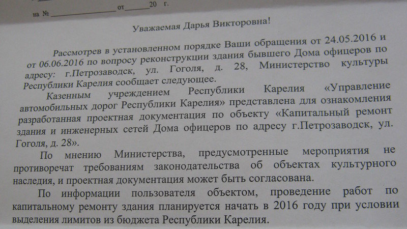 После ответа Государственного комитета РК по транспорту о том, что вопрос выделения средств на капитальный ремонт Дома Офицеров будет рассмотрен только при формировании бюджета Карелии на 2017, я была вынуждена обратиться на прямую линию с президентом, которая проходила в апреле и изложить суть проблемы. Ответа из Администрации Президента так и не последовало, но определенные изменения в ситуации все же произошли.