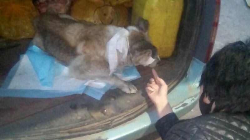 Собачка оказалась наидобрейшей старушкой, просто обессиленной от истощения, наверное, когда-то была домашней собачкой и не понятно почему оказалась на улице. В клинике, ее осмотрели, почистили ушки, взяли анализы, почистили глазки и выписали глазные капли и отправили на откорм. Виолетта взяла ее под личную опеку. Купила ей по дороге колбаску и молоко, собака всё слопала и когда приехали в приют то уже встала на все 4 лапки. Остается только откармливать старушку вкусной пищей. В машине везли замороженное мясо для другого приюта и наша старушка пыталась его по дороге попробовать, но так как оно мерзлое, то не смогла, но приехав в приют она поела колбаски и каши молоком и с куриными лапками.