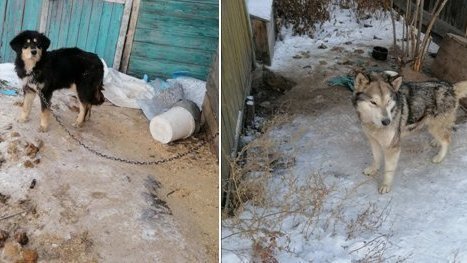 31 декабря 2020 г. о собаках узнал зооволонтер Алексей. Он приехал покормить животных и поскольку ему некуда их забрать, разместил пост с просьбой помочь. Собаки были очень голодные, кроме этого, маламут путалась вокруг дерева цепью и не могла зайти в будку. Как мы узнали позже, собак было четыре, но одну, небольшую, убил сам хозяин. Судя по бутылкам возле дома, понятно, почему это произошло.