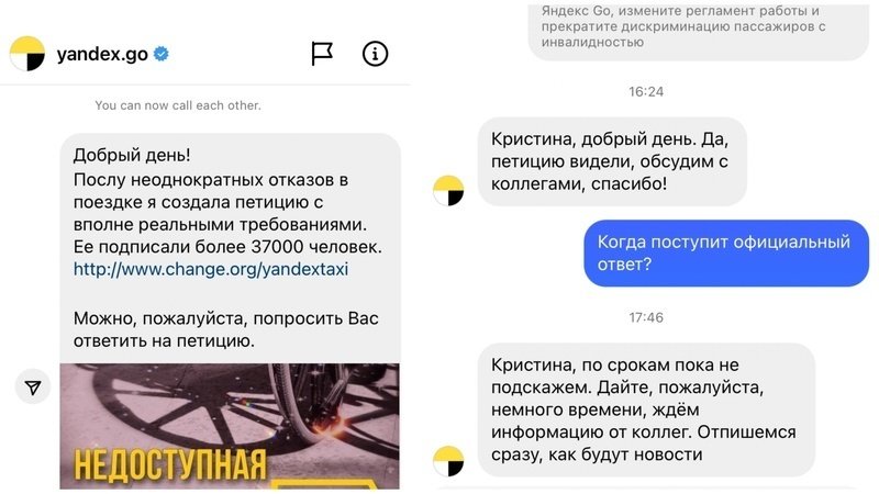 Я также думаю, что сейчас, когда Яндекс.GO точно увидели нашу кампанию и обращения, нужно не останавливаться, а обязательно потребовать ответа на нашу с вами петицию, а главное, ответа на вопрос: какие шаги компания предпримет, чтобы положить конец повсеместной дискриминации пассажиров в инвалидных креслах и людей с инвалидность? Наше предложение – изменение регламента работы с людьми с инвалидностью для водителей и операторов.