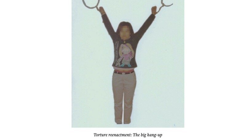 Ms. Yang Jie was arrested in October 2001 by officers from the Anshun Police Station. They beat her and hit her in the stomach with a shovel. They later subjected her to a torture dubbed “the big hang-up” (see image below). Her hands and feet became extremely swollen and she was unable to take care of herself for days afterward.