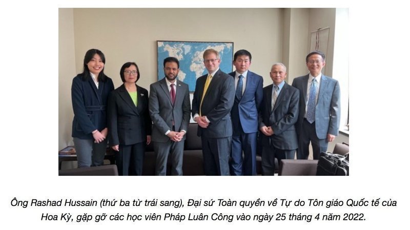 [MINH HUỆ] Ngày 25 tháng 4 năm nay ghi dấu kỷ niệm 23 năm ngày các học viên Pháp Luân Công thỉnh nguyện ôn hòa ở Bắc Kinh. Ông Rashad Hussain, Đại sứ Toàn quyền về Tự do Tôn giáo Quốc tế của Hoa Kỳ, đã gặp đại diện của các học viên Pháp Luân Công tại Bộ Ngoại giao vào ngày này để cập nhật về cuộc bức hại ở Trung Quốc. Ông cũng nhắc lại sự ủng hộ đối với các học viên Pháp Luân Công và lên án cuộc bức hại ở Trung Quốc.