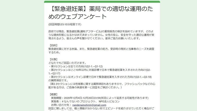 緊急避妊薬を薬局でプロジェクトでは、現在緊急避妊薬の薬局での適切な運用のためのウェブアンケート調査を実施しており、本日が回答の最終日となっております。