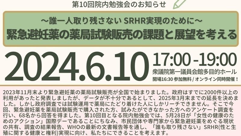 女性が健康を守るために、安心して、適切かつ安全に、緊急避妊薬にアクセスできる社会の実現を目指す「緊急避妊薬の薬局での入手を実現する市民プロジェクト(通称:緊急避妊薬を薬局でプロジェクト)」では、この度第 10 回目となる院内勉強会を開催します。