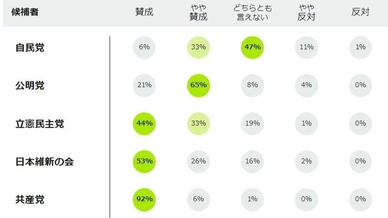 賛成:立憲民主党(44%)、日本維新の会(53%)、共産党(92%)、れいわ新選組(88%)、社民党(61%)、みんなでつくる党(60%)