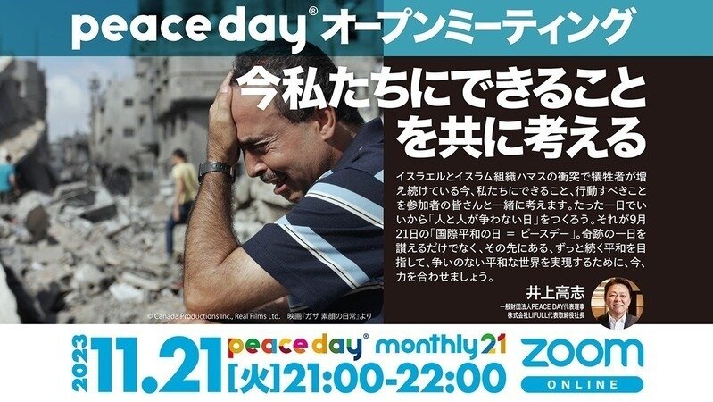Обновление к петицииイスラエル・パレスチナでの「市民に対する無差別攻撃の即時中止/人道的支援の増強/恒久的停戦に向けた平和会議の設置」を日本政府として正式に提案を! 一般財団法人PEACE DAY【今夜21日(火)21時開催】PEACE DAY monthly 21 #24 のお知らせ
