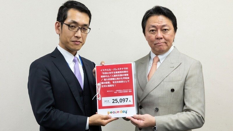 Обновление к петицииイスラエル・パレスチナでの「市民に対する無差別攻撃の即時中止/人道的支援の増強/恒久的停戦に向けた平和会議の設置」を日本政府として正式に提案を! 一般財団法人PEACE DAY署名2万5,097筆を外務省に提出しました。