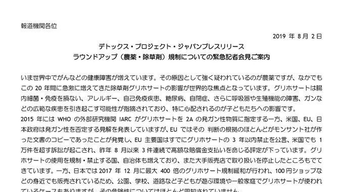 急なお知らせですが、8月8日(木)16時から衆議院第1議員会館第4会議室にてデトックス・プロジェクト・ジャパン主催の国会議員等によるラウンドアップ/グリホサート規制についての緊急の記者会見が行われます。
