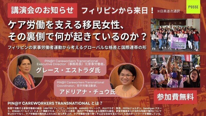 この度、ケア労働を支える移民・家事労働者の社会運動を率いるフィリピンの社会・労働活動家を招いて、下記のイベントを開催する運びとなりましたので、お知らせいたします!