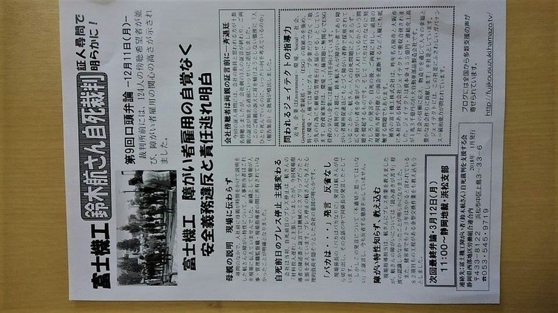 Actualización de la petición「バカはバカなりに努力しろ」とノートに書いた息子(鈴木航)の自死の理由を明らかにしたい。障がい者も安心して働くことのできる社会にするために、裁判を起こしたご両親を応援してください1月23日(火)富士機工のあるJR鷲津駅で宣伝しました!