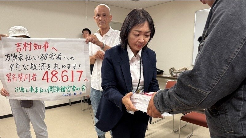 2025年8月6日、万博工事未払い問題被害者の会が大阪府吉村知事に「有効な救済策」を求め、48,617筆の署名を提出しました。