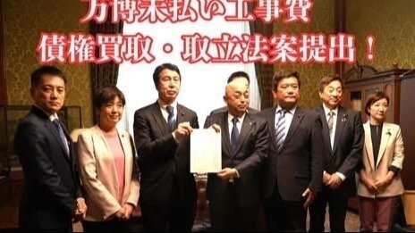 内容は未払い被害者の債権(代金をもらう権利)を万博協会が被害者から買い取る(=被害者にお金が支払われる)。そして、万博協会が未払いをおこなっている業者からその分のお金を回収する、という内容の法案です。