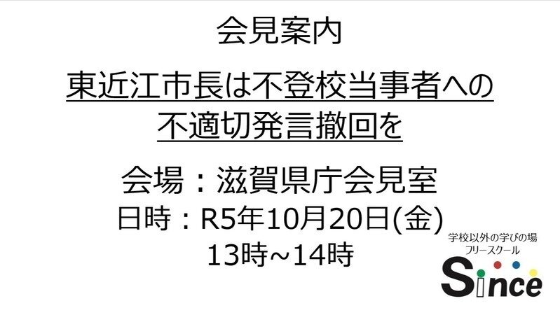 2023年10月17日、小椋正清東近江市長は不登校対策について議論する滋賀県の首長会議の場において次のような発言を行いました。「フリースクールってね、よかれと思ってやることが本当にこの国家のね根幹をね、崩してしまうことになりかねないぐらいに私、危機感持ってるんです。」「不登校は大半は親の責任。財政支援を国が言うべきではない。(フリースクールの)存在を認めるかどうかの論議をもっとすべきだ」(会見後発言)。