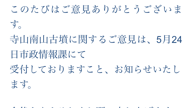 ありがとうございます。本日、2018年6月1日(金)に堺市文化財課で電子書籍と意見書が、2018年5月24日(木)付けで受理されていたことが確認出来ました。これからが、本当の交渉になります。みなさまの忌憚のないご意見を賜りたくよろしくお願い申し上げます。