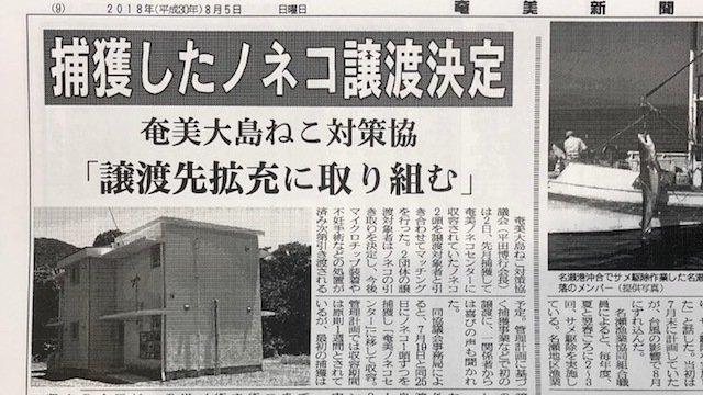 奄美大島ではノネコ管理計画により、山中にいるノネコの捕獲が7月中旬から開始され、これまでに2頭の猫が捕獲されていました。奄美大島ねこ対策協議会は、当初引き取り手がいなければ、1週間で安楽死とのことでしたが、引き取り申請者との日程調整に応える形で、収容期間を延長し、2頭の猫は処分されず、引き取られたのことです。