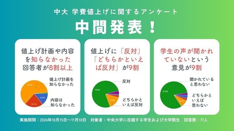 引き続き多くの学生の声を集め、大学に届けたいと思います。中大生の方は、ぜひアンケートに声をよせていただくとともに、友人等にも広げてください。【中大生の方対象:アンケート回答はこちらから】