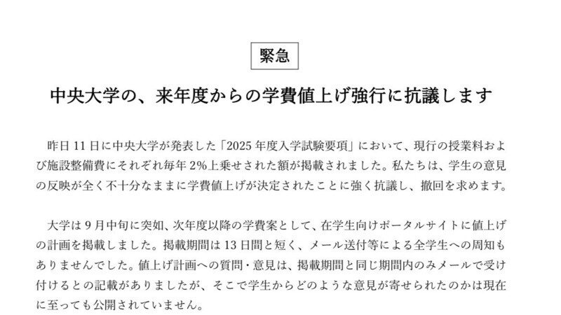 抗議文「中央大学の、来年度からの学費値上げ強行に抗議します」