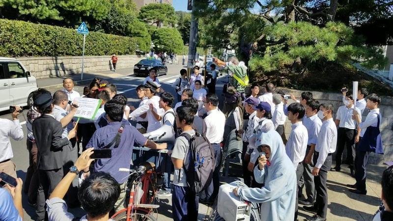 当日は集会開始の数十分前から職員が集結し、「立ち入り禁止」の「学外者」を排除するためのピケストが組まれましたが、居合わせた学生が直ちに野次を飛ばすなど、会場は早くから温まりました。