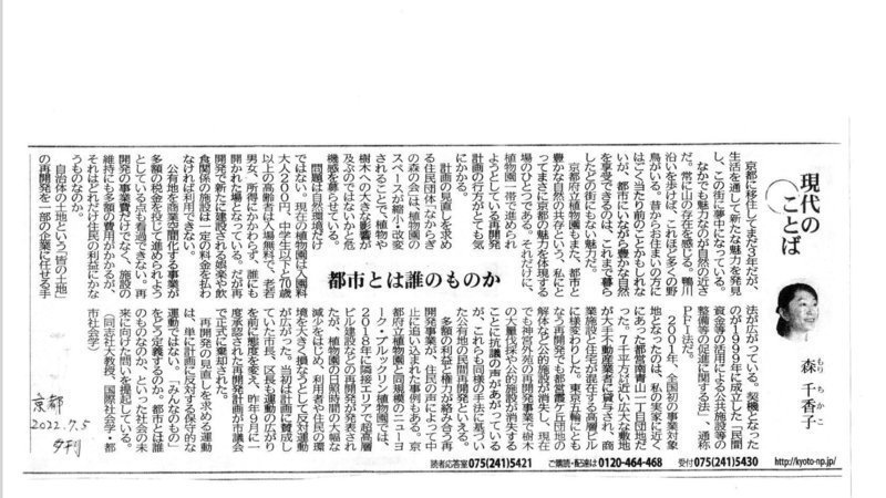 京都府立植物園もまた、都市と豊かな自然の共存という、私にとってまさに京都の魅力を体現する場のひとつである。それだけに、植物園一帯で進められようとしている再開発計画の行方がとても気にかかる。