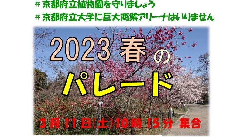 直前になってのお知らせで恐縮ですが、京都府に対して、 人々の声を目に見える形でアピールするために、昨年と同じようにみんなで集まって行進する「春のパレード」を3月11日(土)午前中に行います。北大路通り、北山通りなどの植物園周辺を歩きます。全国のみなさま!春の京都と植物園を楽しみつつ「春のパレード」に参加しましょう。