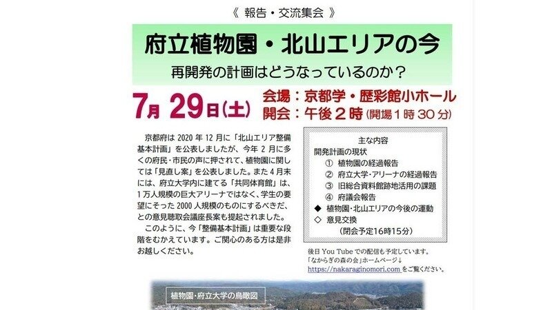 7月29日(土)14:00~16:15に京都学・歴彩館で報告・交流集会「植物園・北山エリアの今 再開発の計画はどうなっているのか?」を開催します。