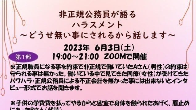 非正規公務員voices(当事者・退職者の集団)からのお知らせです。只今非正規公務員のハラスメントアンケートを実施中ですが、その一環としてこちらのイベントを行います。 非正規公務員がハラスメントを訴えることは非常に難しいことです。 訴えただけで雇止めになるのではないか、周りから白い目で見られるのではないか…そのため、我慢して病気になったり、言い出さないまま退職してしまうことが多い。そして勇気を出して訴えても問題のテーブルにのせてもらえないことがとても多い。今回、代読によるハローワーク非正規・雇止めの方の赤裸々なハラスメントの告白もあります。こんなことがあっても、公務だったら、非正規だったら簡単に許されるのでしょうか。 NO!ハラスメント!本当にこのままでよいのか?当事者が語ります。