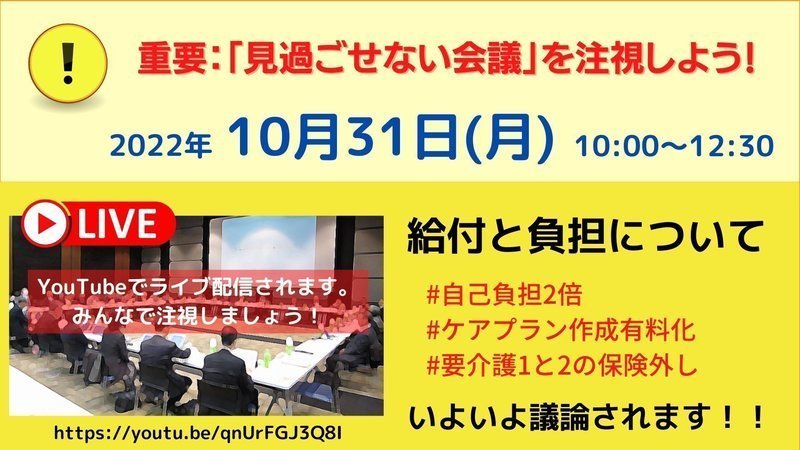 ついに「#自己負担2倍」「#ケアプラン作成有料化」「#要介護1と2の保険外し」などを含む、「給付と負担について」を議題とした、社会保障審議会 介護保険部会が、10/31(月)10:00から、開催されます。