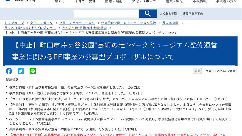 町田市が今年5月から手続きを進めていた「芹ヶ谷公園“芸術の杜”パークミュージアム整備運営事業(PFI事業)の事業者選定(プロポーザル)が中止となりました。理由は事業スケジュールに変更が生じたためとのことです。