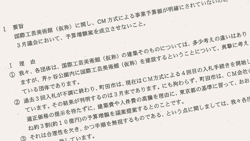 町田市は、CM(コンストラクション・マネジメント)の結果を待たず、工事費縮小のための計画見直しを行わないまま、国際工芸美術館整備工事の予算を10億円以上増額しようとしています。