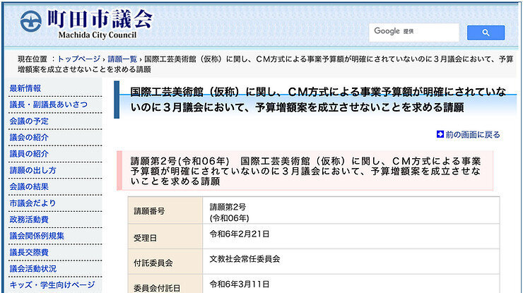 町田市が国際工芸美術館建設工事の予算を10億円以上増額しようとしていることに対し、複数の市民グループが連名で、予算の増額案を成立させないことを求める請願書を市議会に提出していました。