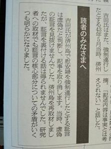 - 朝日新聞社は、8/5,8/6の朝刊で、いわゆる従軍慰安婦問題の検証特集を掲載し、その中で、吉田証言などが虚偽であったことを認め、記事を取り消しました。