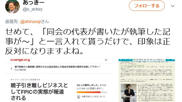 「(本キャンペーンのスクリーンショットとともに)せめて、「同会の代表が書いたが執筆した記事が~」と一言入れて貰うだけで、印象は正反対になりますよね。」(あっきー)